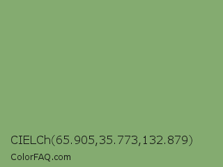 CIELCh 65.905,35.773,132.879 Color is a normal green color and the nearest color is Asparagus #87a96b. Hex code #84ab70 and RGB value is rgb(132,171,112). In RGB color space, this color is composed of 52% red, 67% green, 44% blue, In CMYK color space, this color is composed of 23% cyan, 0% magenta, 35% yellow , 33% black , In HSL color space, this color has a hue angle of 100° , 26% saturation and 55% lightness.