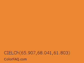 CIELCh 65.907,68.041,61.803 Color is a normal orange color and the nearest color is Cadmium Orange #ed872d. Hex code #eb8730 and RGB value is rgb(235,135,48). In RGB color space, this color is composed of 92% red, 53% green, 19% blue, In CMYK color space, this color is composed of 0% cyan, 43% magenta, 80% yellow , 8% black , In HSL color space, this color has a hue angle of 28° , 82% saturation and 55% lightness.