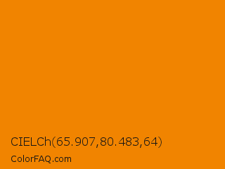 CIELCh 65.907,80.483,64 Color is a normal orange color and the nearest color is Tangerine #f28500. Hex code #f18400 and RGB value is rgb(241,132,0). In RGB color space, this color is composed of 95% red, 52% green, 0% blue, In CMYK color space, this color is composed of 0% cyan, 45% magenta, 100% yellow , 5% black , In HSL color space, this color has a hue angle of 33° , 100% saturation and 47% lightness.