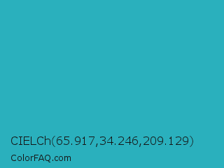 CIELCh 65.917,34.246,209.129 Color is a normal cyan color and the nearest color is Maximum Blue Green #30bfbf. Hex code #2ab0bd and RGB value is rgb(42,176,189). In RGB color space, this color is composed of 16% red, 69% green, 74% blue, In CMYK color space, this color is composed of 78% cyan, 7% magenta, 0% yellow , 26% black , In HSL color space, this color has a hue angle of 185° , 64% saturation and 45% lightness.