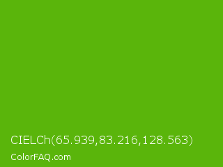CIELCh 65.939,83.216,128.563 Color is a normal green color and the nearest color is Kelly Green #4cbb17. Hex code #5ab50b and RGB value is rgb(90,181,11). In RGB color space, this color is composed of 35% red, 71% green, 4% blue, In CMYK color space, this color is composed of 50% cyan, 0% magenta, 94% yellow , 29% black , In HSL color space, this color has a hue angle of 92° , 89% saturation and 38% lightness.