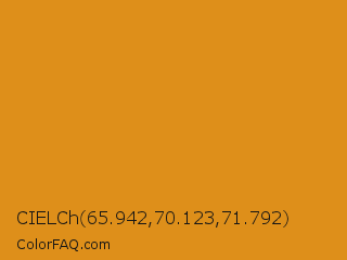 CIELCh 65.942,70.123,71.792 Color is a normal orange color and the nearest color is Dixie #e29418. Hex code #de8f1a and RGB value is rgb(222,143,26). In RGB color space, this color is composed of 87% red, 56% green, 10% blue, In CMYK color space, this color is composed of 0% cyan, 36% magenta, 88% yellow , 13% black , In HSL color space, this color has a hue angle of 36° , 79% saturation and 49% lightness.