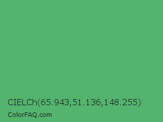 CIELCh 65.943,51.136,148.255 Color is a normal green color and the nearest color is Fern #63b76c. Hex code #54b36e and RGB value is rgb(84,179,110). In RGB color space, this color is composed of 33% red, 70% green, 43% blue, In CMYK color space, this color is composed of 53% cyan, 0% magenta, 39% yellow , 30% black , In HSL color space, this color has a hue angle of 136° , 38% saturation and 52% lightness.