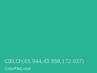 CIELCh 65.944,43.958,172.037 Color is a normal cyan color and the nearest color is Mountain Meadow #30ba8f. Hex code #29b494 and RGB value is rgb(41,180,148). In RGB color space, this color is composed of 16% red, 71% green, 58% blue, In CMYK color space, this color is composed of 77% cyan, 0% magenta, 18% yellow , 29% black , In HSL color space, this color has a hue angle of 166° , 63% saturation and 43% lightness.