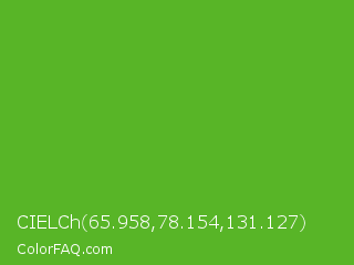 CIELCh 65.958,78.154,131.127 Color is a normal green color and the nearest color is Green RYB #66b032. Hex code #58b527 and RGB value is rgb(88,181,39). In RGB color space, this color is composed of 35% red, 71% green, 15% blue, In CMYK color space, this color is composed of 51% cyan, 0% magenta, 78% yellow , 29% black , In HSL color space, this color has a hue angle of 99° , 65% saturation and 43% lightness.