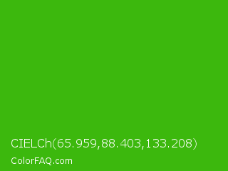 CIELCh 65.959,88.403,133.208 Color is a normal green color and the nearest color is Kelly Green #4cbb17. Hex code #3cb80d and RGB value is rgb(60,184,13). In RGB color space, this color is composed of 24% red, 72% green, 5% blue, In CMYK color space, this color is composed of 67% cyan, 0% magenta, 93% yellow , 28% black , In HSL color space, this color has a hue angle of 104° , 87% saturation and 39% lightness.