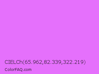 CIELCh 65.962,82.339,322.219 Color is a light purple color and the nearest color is Heliotrope #df73ff. Hex code #e570fc and RGB value is rgb(229,112,252). In RGB color space, this color is composed of 90% red, 44% green, 99% blue, In CMYK color space, this color is composed of 9% cyan, 56% magenta, 0% yellow , 1% black , In HSL color space, this color has a hue angle of 290° , 96% saturation and 71% lightness.