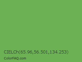 CIELCh 65.96,56.501,134.253 Color is a normal green color and the nearest color is Bud Green #7bb661. Hex code #6cb154 and RGB value is rgb(108,177,84). In RGB color space, this color is composed of 42% red, 69% green, 33% blue, In CMYK color space, this color is composed of 39% cyan, 0% magenta, 53% yellow , 31% black , In HSL color space, this color has a hue angle of 105° , 37% saturation and 51% lightness.