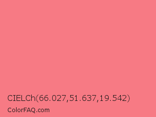 CIELCh 66.027,51.637,19.542 Color is a light red color and the nearest color is Froly #f57584. Hex code #f77a84 and RGB value is rgb(247,122,132). In RGB color space, this color is composed of 97% red, 48% green, 52% blue, In CMYK color space, this color is composed of 0% cyan, 51% magenta, 47% yellow , 3% black , In HSL color space, this color has a hue angle of 355° , 89% saturation and 72% lightness.