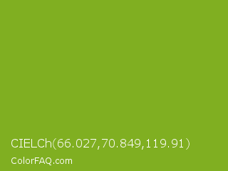 CIELCh 66.027,70.849,119.91 Color is a normal green color and the nearest color is Lima #76bd17. Hex code #80af21 and RGB value is rgb(128,175,33). In RGB color space, this color is composed of 50% red, 69% green, 13% blue, In CMYK color space, this color is composed of 27% cyan, 0% magenta, 81% yellow , 31% black , In HSL color space, this color has a hue angle of 80° , 68% saturation and 41% lightness.