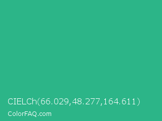 CIELCh 66.029,48.277,164.611 Color is a normal green color and the nearest color is Mountain Meadow #30ba8f. Hex code #2cb588 and RGB value is rgb(44,181,136). In RGB color space, this color is composed of 17% red, 71% green, 53% blue, In CMYK color space, this color is composed of 76% cyan, 0% magenta, 25% yellow , 29% black , In HSL color space, this color has a hue angle of 160° , 61% saturation and 44% lightness.