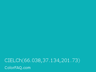 CIELCh 66.038,37.134,201.73 Color is a normal cyan color and the nearest color is Tiffany Blue #0abab5. Hex code #0bb2b8 and RGB value is rgb(11,178,184). In RGB color space, this color is composed of 4% red, 70% green, 72% blue, In CMYK color space, this color is composed of 94% cyan, 3% magenta, 0% yellow , 28% black , In HSL color space, this color has a hue angle of 182° , 89% saturation and 38% lightness.