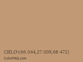 CIELCh 66.044,27.009,68.472 Color is a light orange color and the nearest color is Desert Camel #c19a6b. Hex code #c19974 and RGB value is rgb(193,153,116). In RGB color space, this color is composed of 76% red, 60% green, 45% blue, In CMYK color space, this color is composed of 0% cyan, 21% magenta, 40% yellow , 24% black , In HSL color space, this color has a hue angle of 29° , 38% saturation and 61% lightness.