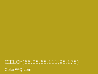 CIELCh 66.05,65.111,95.175 Color is a normal yellow color and the nearest color is Sahara #b7a214. Hex code #b5a11a and RGB value is rgb(181,161,26). In RGB color space, this color is composed of 71% red, 63% green, 10% blue, In CMYK color space, this color is composed of 0% cyan, 11% magenta, 86% yellow , 29% black , In HSL color space, this color has a hue angle of 52° , 75% saturation and 41% lightness.