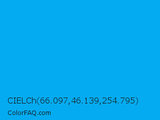 CIELCh 66.097,46.139,254.795 Color is a normal blue color and the nearest color is Vivid Cerulean #00aaee. Hex code #05abf0 and RGB value is rgb(5,171,240). In RGB color space, this color is composed of 2% red, 67% green, 94% blue, In CMYK color space, this color is composed of 98% cyan, 29% magenta, 0% yellow , 6% black , In HSL color space, this color has a hue angle of 198° , 96% saturation and 48% lightness.
