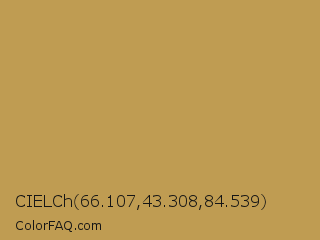 CIELCh 66.107,43.308,84.539 Color is a normal orange color and the nearest color is Aztec Gold #c39953. Hex code #bf9c52 and RGB value is rgb(191,156,82). In RGB color space, this color is composed of 75% red, 61% green, 32% blue, In CMYK color space, this color is composed of 0% cyan, 18% magenta, 57% yellow , 25% black , In HSL color space, this color has a hue angle of 41° , 46% saturation and 54% lightness.