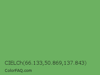 CIELCh 66.133,50.869,137.843 Color is a normal green color and the nearest color is Fern #63b76c. Hex code #6cb161 and RGB value is rgb(108,177,97). In RGB color space, this color is composed of 42% red, 69% green, 38% blue, In CMYK color space, this color is composed of 39% cyan, 0% magenta, 45% yellow , 31% black , In HSL color space, this color has a hue angle of 112° , 34% saturation and 54% lightness.