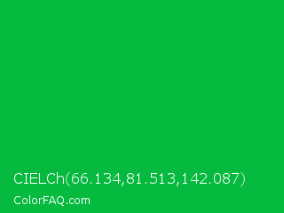 CIELCh 66.134,81.513,142.087 Color is a normal green color and the nearest color is Dark Pastel Green #03c03c. Hex code #05ba3e and RGB value is rgb(5,186,62). In RGB color space, this color is composed of 2% red, 73% green, 24% blue, In CMYK color space, this color is composed of 97% cyan, 0% magenta, 67% yellow , 27% black , In HSL color space, this color has a hue angle of 139° , 95% saturation and 37% lightness.
