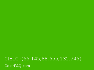 CIELCh 66.145,88.655,131.746 Color is a normal green color and the nearest color is Kelly Green #4cbb17. Hex code #44b801 and RGB value is rgb(68,184,1). In RGB color space, this color is composed of 27% red, 72% green, 0% blue, In CMYK color space, this color is composed of 63% cyan, 0% magenta, 99% yellow , 28% black , In HSL color space, this color has a hue angle of 98° , 99% saturation and 36% lightness.
