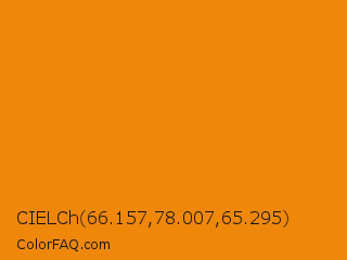 CIELCh 66.157,78.007,65.295 Color is a normal orange color and the nearest color is Tangerine #f28500. Hex code #ee870a and RGB value is rgb(238,135,10). In RGB color space, this color is composed of 93% red, 53% green, 4% blue, In CMYK color space, this color is composed of 0% cyan, 43% magenta, 96% yellow , 7% black , In HSL color space, this color has a hue angle of 33° , 92% saturation and 49% lightness.
