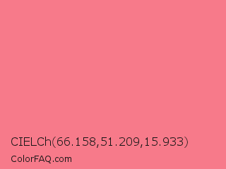 CIELCh 66.158,51.209,15.933 Color is a light red color and the nearest color is Froly #f57584. Hex code #f77a8a and RGB value is rgb(247,122,138). In RGB color space, this color is composed of 97% red, 48% green, 54% blue, In CMYK color space, this color is composed of 0% cyan, 51% magenta, 44% yellow , 3% black , In HSL color space, this color has a hue angle of 352° , 89% saturation and 72% lightness.