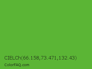 CIELCh 66.158,73.471,132.43 Color is a normal green color and the nearest color is Green RYB #66b032. Hex code #5bb535 and RGB value is rgb(91,181,53). In RGB color space, this color is composed of 36% red, 71% green, 21% blue, In CMYK color space, this color is composed of 50% cyan, 0% magenta, 71% yellow , 29% black , In HSL color space, this color has a hue angle of 102° , 55% saturation and 46% lightness.