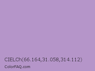 CIELCh 66.164,31.058,314.112 Color is a light purple color and the nearest color is East Side #ac91ce. Hex code #b595c9 and RGB value is rgb(181,149,201). In RGB color space, this color is composed of 71% red, 58% green, 79% blue, In CMYK color space, this color is composed of 10% cyan, 26% magenta, 0% yellow , 21% black , In HSL color space, this color has a hue angle of 277° , 33% saturation and 69% lightness.