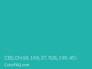 CIELCh 66.169,37.926,190.45 Color is a normal cyan color and the nearest color is Light Sea Green #20b2aa. Hex code #21b3ac and RGB value is rgb(33,179,172). In RGB color space, this color is composed of 13% red, 70% green, 67% blue, In CMYK color space, this color is composed of 82% cyan, 0% magenta, 4% yellow , 30% black , In HSL color space, this color has a hue angle of 177° , 69% saturation and 42% lightness.