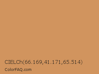 CIELCh 66.169,41.171,65.514 Color is a normal orange color and the nearest color is Brown Yellow #cc9966. Hex code #d1945e and RGB value is rgb(209,148,94). In RGB color space, this color is composed of 82% red, 58% green, 37% blue, In CMYK color space, this color is composed of 0% cyan, 29% magenta, 55% yellow , 18% black , In HSL color space, this color has a hue angle of 28° , 56% saturation and 59% lightness.
