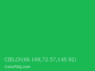 CIELCh 66.169,72.57,145.92 Color is a normal green color and the nearest color is Green Pantone #00ad43. Hex code #1ab953 and RGB value is rgb(26,185,83). In RGB color space, this color is composed of 10% red, 73% green, 33% blue, In CMYK color space, this color is composed of 86% cyan, 0% magenta, 55% yellow , 27% black , In HSL color space, this color has a hue angle of 142° , 75% saturation and 41% lightness.