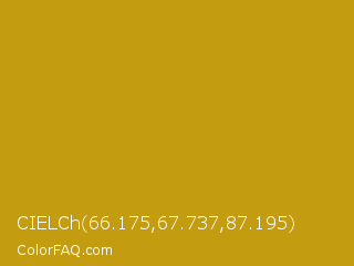 CIELCh 66.175,67.737,87.195 Color is a normal yellow color and the nearest color is Pizza #c99415. Hex code #c49c10 and RGB value is rgb(196,156,16). In RGB color space, this color is composed of 77% red, 61% green, 6% blue, In CMYK color space, this color is composed of 0% cyan, 20% magenta, 92% yellow , 23% black , In HSL color space, this color has a hue angle of 47° , 85% saturation and 42% lightness.