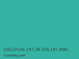 CIELCh 66.197,38.035,181.898 Color is a normal cyan color and the nearest color is Keppel #3ab09e. Hex code #34b3a2 and RGB value is rgb(52,179,162). In RGB color space, this color is composed of 20% red, 70% green, 64% blue, In CMYK color space, this color is composed of 71% cyan, 0% magenta, 9% yellow , 30% black , In HSL color space, this color has a hue angle of 172° , 55% saturation and 45% lightness.