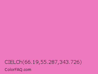 CIELCh 66.19,55.287,343.726 Color is a light magenta color and the nearest color is Persian Pink #f77fbe. Hex code #ee79be and RGB value is rgb(238,121,190). In RGB color space, this color is composed of 93% red, 47% green, 75% blue, In CMYK color space, this color is composed of 0% cyan, 49% magenta, 20% yellow , 7% black , In HSL color space, this color has a hue angle of 325° , 77% saturation and 70% lightness.
