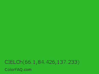 CIELCh 66.1,84.426,137.233 Color is a normal green color and the nearest color is Wageningen Green #34b233. Hex code #2eb92b and RGB value is rgb(46,185,43). In RGB color space, this color is composed of 18% red, 73% green, 17% blue, In CMYK color space, this color is composed of 75% cyan, 0% magenta, 77% yellow , 27% black , In HSL color space, this color has a hue angle of 119° , 62% saturation and 45% lightness.