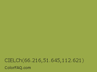 CIELCh 66.216,51.645,112.621 Color is a normal yellow color and the nearest color is Sushi #87ab39. Hex code #99a947 and RGB value is rgb(153,169,71). In RGB color space, this color is composed of 60% red, 66% green, 28% blue, In CMYK color space, this color is composed of 9% cyan, 0% magenta, 58% yellow , 34% black , In HSL color space, this color has a hue angle of 70° , 41% saturation and 47% lightness.