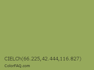 CIELCh 66.225,42.444,116.827 Color is a normal lime color and the nearest color is Chelsea Cucumber #83aa5d. Hex code #96a95b and RGB value is rgb(150,169,91). In RGB color space, this color is composed of 59% red, 66% green, 36% blue, In CMYK color space, this color is composed of 11% cyan, 0% magenta, 46% yellow , 34% black , In HSL color space, this color has a hue angle of 75° , 31% saturation and 51% lightness.