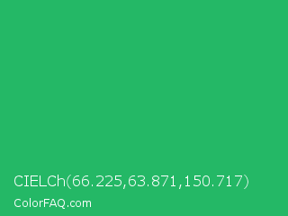 CIELCh 66.225,63.871,150.717 Color is a normal green color and the nearest color is Green Crayola #1cac78. Hex code #24b866 and RGB value is rgb(36,184,102). In RGB color space, this color is composed of 14% red, 72% green, 40% blue, In CMYK color space, this color is composed of 80% cyan, 0% magenta, 45% yellow , 28% black , In HSL color space, this color has a hue angle of 147° , 67% saturation and 43% lightness.