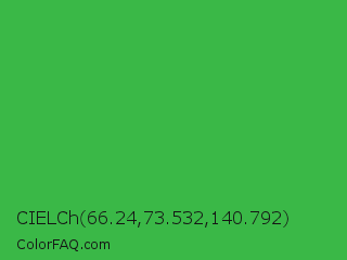 CIELCh 66.24,73.532,140.792 Color is a normal green color and the nearest color is Wageningen Green #34b233. Hex code #3ab847 and RGB value is rgb(58,184,71). In RGB color space, this color is composed of 23% red, 72% green, 28% blue, In CMYK color space, this color is composed of 68% cyan, 0% magenta, 61% yellow , 28% black , In HSL color space, this color has a hue angle of 126° , 52% saturation and 47% lightness.