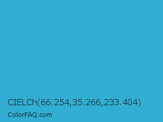 CIELCh 66.254,35.266,233.404 Color is a normal blue color and the nearest color is Scooter #2ebfd4. Hex code #32aed3 and RGB value is rgb(50,174,211). In RGB color space, this color is composed of 20% red, 68% green, 83% blue, In CMYK color space, this color is composed of 76% cyan, 18% magenta, 0% yellow , 17% black , In HSL color space, this color has a hue angle of 194° , 65% saturation and 51% lightness.