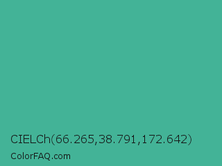 CIELCh 66.265,38.791,172.642 Color is a normal cyan color and the nearest color is Keppel #3ab09e. Hex code #43b397 and RGB value is rgb(67,179,151). In RGB color space, this color is composed of 26% red, 70% green, 59% blue, In CMYK color space, this color is composed of 63% cyan, 0% magenta, 16% yellow , 30% black , In HSL color space, this color has a hue angle of 165° , 46% saturation and 48% lightness.