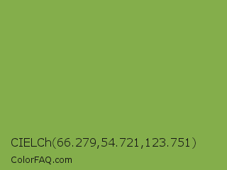 CIELCh 66.279,54.721,123.751 Color is a normal green color and the nearest color is Chelsea Cucumber #83aa5d. Hex code #84ae4b and RGB value is rgb(132,174,75). In RGB color space, this color is composed of 52% red, 68% green, 29% blue, In CMYK color space, this color is composed of 24% cyan, 0% magenta, 57% yellow , 32% black , In HSL color space, this color has a hue angle of 85° , 40% saturation and 49% lightness.