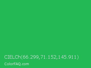 CIELCh 66.299,71.152,145.911 Color is a normal green color and the nearest color is Chateau Green #40a860. Hex code #23b955 and RGB value is rgb(35,185,85). In RGB color space, this color is composed of 14% red, 73% green, 33% blue, In CMYK color space, this color is composed of 81% cyan, 0% magenta, 54% yellow , 27% black , In HSL color space, this color has a hue angle of 140° , 68% saturation and 43% lightness.