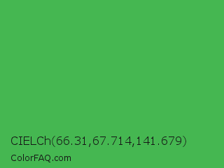 CIELCh 66.31,67.714,141.679 Color is a normal green color and the nearest color is Chateau Green #40a860. Hex code #45b751 and RGB value is rgb(69,183,81). In RGB color space, this color is composed of 27% red, 72% green, 32% blue, In CMYK color space, this color is composed of 62% cyan, 0% magenta, 56% yellow , 28% black , In HSL color space, this color has a hue angle of 126° , 45% saturation and 49% lightness.