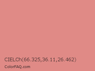 CIELCh 66.325,36.11,26.462 Color is a light red color and the nearest color is My Pink #d69188. Hex code #e08a86 and RGB value is rgb(224,138,134). In RGB color space, this color is composed of 88% red, 54% green, 53% blue, In CMYK color space, this color is composed of 0% cyan, 38% magenta, 40% yellow , 12% black , In HSL color space, this color has a hue angle of 3° , 59% saturation and 70% lightness.