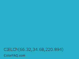 CIELCh 66.32,34.68,220.894 Color is a normal cyan color and the nearest color is Ball Blue #21abcd. Hex code #29b0c9 and RGB value is rgb(41,176,201). In RGB color space, this color is composed of 16% red, 69% green, 79% blue, In CMYK color space, this color is composed of 80% cyan, 12% magenta, 0% yellow , 21% black , In HSL color space, this color has a hue angle of 189° , 66% saturation and 47% lightness.
