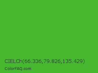 CIELCh 66.336,79.826,135.429 Color is a normal green color and the nearest color is Wageningen Green #34b233. Hex code #45b830 and RGB value is rgb(69,184,48). In RGB color space, this color is composed of 27% red, 72% green, 19% blue, In CMYK color space, this color is composed of 63% cyan, 0% magenta, 74% yellow , 28% black , In HSL color space, this color has a hue angle of 111° , 59% saturation and 45% lightness.