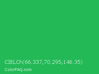 CIELCh 66.337,70.295,146.35 Color is a normal green color and the nearest color is Chateau Green #40a860. Hex code #24b957 and RGB value is rgb(36,185,87). In RGB color space, this color is composed of 14% red, 73% green, 34% blue, In CMYK color space, this color is composed of 81% cyan, 0% magenta, 53% yellow , 27% black , In HSL color space, this color has a hue angle of 141° , 67% saturation and 43% lightness.