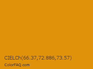 CIELCh 66.37,72.886,73.57 Color is a normal orange color and the nearest color is Harvest Gold #da9100. Hex code #de910b and RGB value is rgb(222,145,11). In RGB color space, this color is composed of 87% red, 57% green, 4% blue, In CMYK color space, this color is composed of 0% cyan, 35% magenta, 95% yellow , 13% black , In HSL color space, this color has a hue angle of 38° , 91% saturation and 46% lightness.
