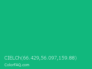 CIELCh 66.429,56.097,159.88 Color is a normal green color and the nearest color is Mountain Meadow Crayola #1ab385. Hex code #11b87d and RGB value is rgb(17,184,125). In RGB color space, this color is composed of 7% red, 72% green, 49% blue, In CMYK color space, this color is composed of 91% cyan, 0% magenta, 32% yellow , 28% black , In HSL color space, this color has a hue angle of 159° , 83% saturation and 39% lightness.