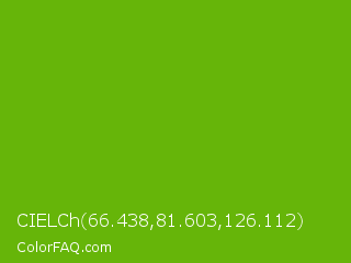 CIELCh 66.438,81.603,126.112 Color is a normal green color and the nearest color is Christi #67a712. Hex code #66b509 and RGB value is rgb(102,181,9). In RGB color space, this color is composed of 40% red, 71% green, 4% blue, In CMYK color space, this color is composed of 44% cyan, 0% magenta, 95% yellow , 29% black , In HSL color space, this color has a hue angle of 88° , 91% saturation and 37% lightness.